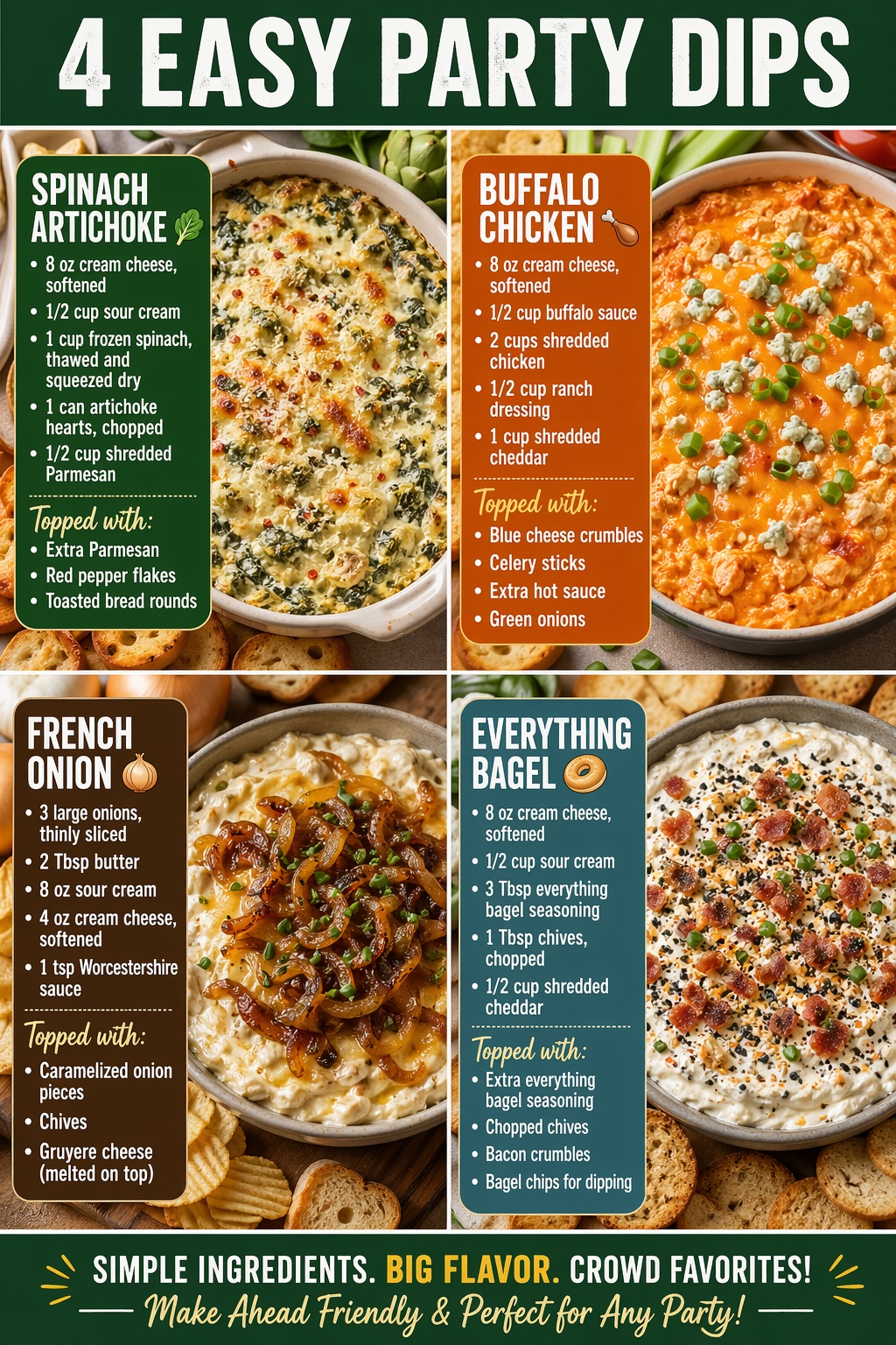 Meal prep tip: Hot dips can be assembled a day ahead and stored covered in the fridge. Pop them in the oven when guests arrive — the aroma alone will get everyone excited.