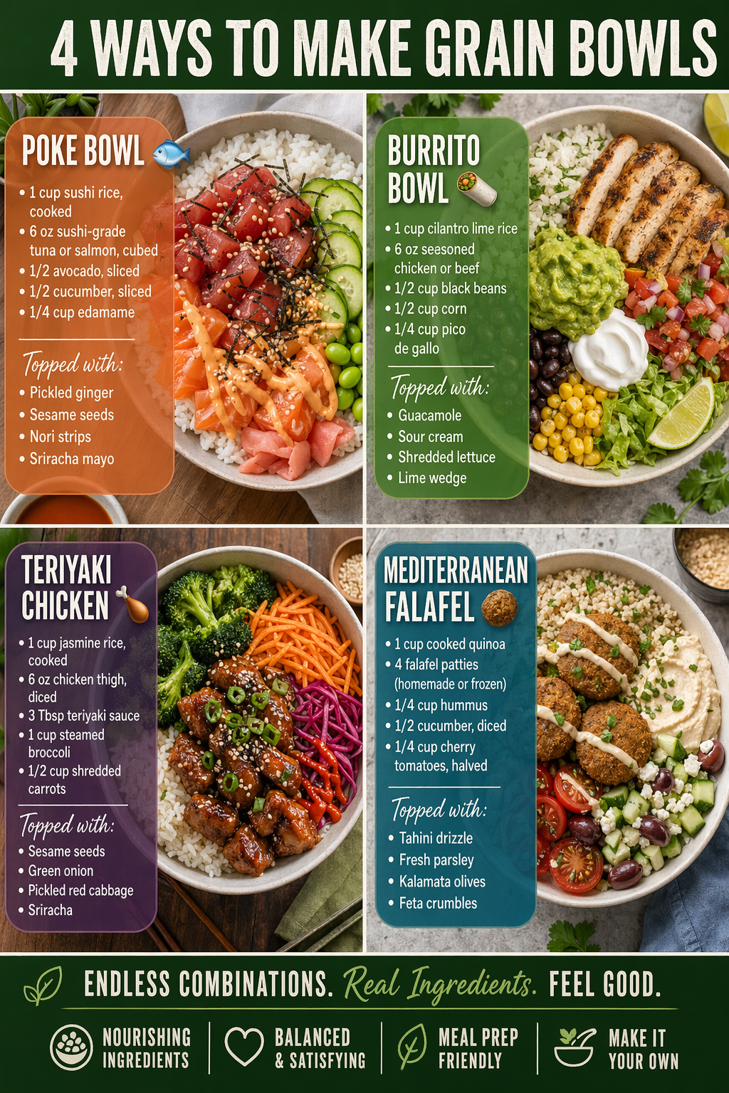 Grain bowls are the ultimate meal prep solution — a base of hearty grains topped with protein, veggies, and a killer sauce. These four bowls are balanced, beautiful, and keep you full for hours!