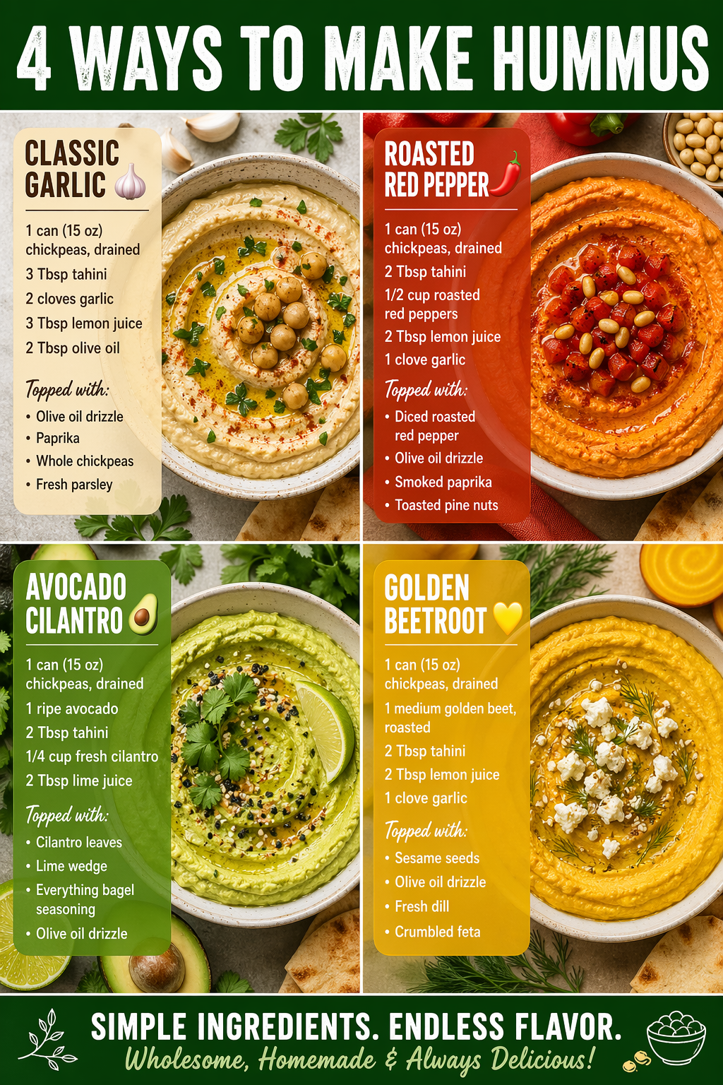 Meal prep tip: All four hummus flavors store beautifully in airtight containers for up to 5 days. Drizzle with olive oil before sealing to keep the top from drying out.