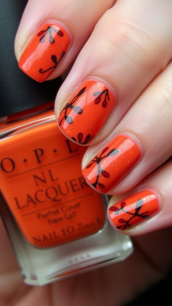 This stunning nail art design perfectly encapsulates the essence of fall. The vibrant orange polish contrasts beautifully with the delicate floral patterns, featuring rich reds, warm yellows, and earthy browns that mimic the changing leaves of autumn. It’s a delightful way to celebrate the season and add a splash of color to your look!