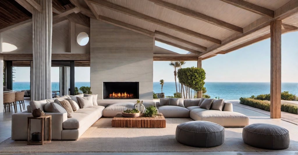 This design embodies the essence of a beach resort-inspired farmhouse with its spacious living area and open concept layout. Large windows offer breathtaking views of the ocean, allowing natural light to flood the room and create a serene ambiance. The decor features a mix of rustic elements such as distressed wood beams and whitewashed walls, evoking the charm of a coastal farmhouse. Plush, comfortable furnishings in neutral tones add a touch of luxury while maintaining a relaxed beach house feel. The overall atmosphere is one of casual elegance, perfect for a comfortable yet stylish coastal living experience.