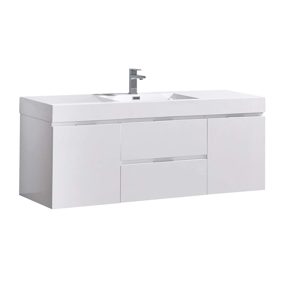 The Fresca Vista 60 Inch Wall Hung Vanity really updates the look of a bathroom. Its white acrylic sink with a thick profile feels very modern. The wall-mounted feature adds a floating, spacious feel to the room, making it seem larger.
