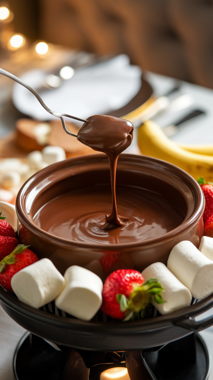 This rich chocolate fondue features smooth, melted chocolate with a glossy finish, providing a luscious dip for fresh strawberries, bananas, and marshmallows. The taste is deeply satisfying – a perfect blend of sweetness and richness that creates a delightful contrast with the fresh dippers.