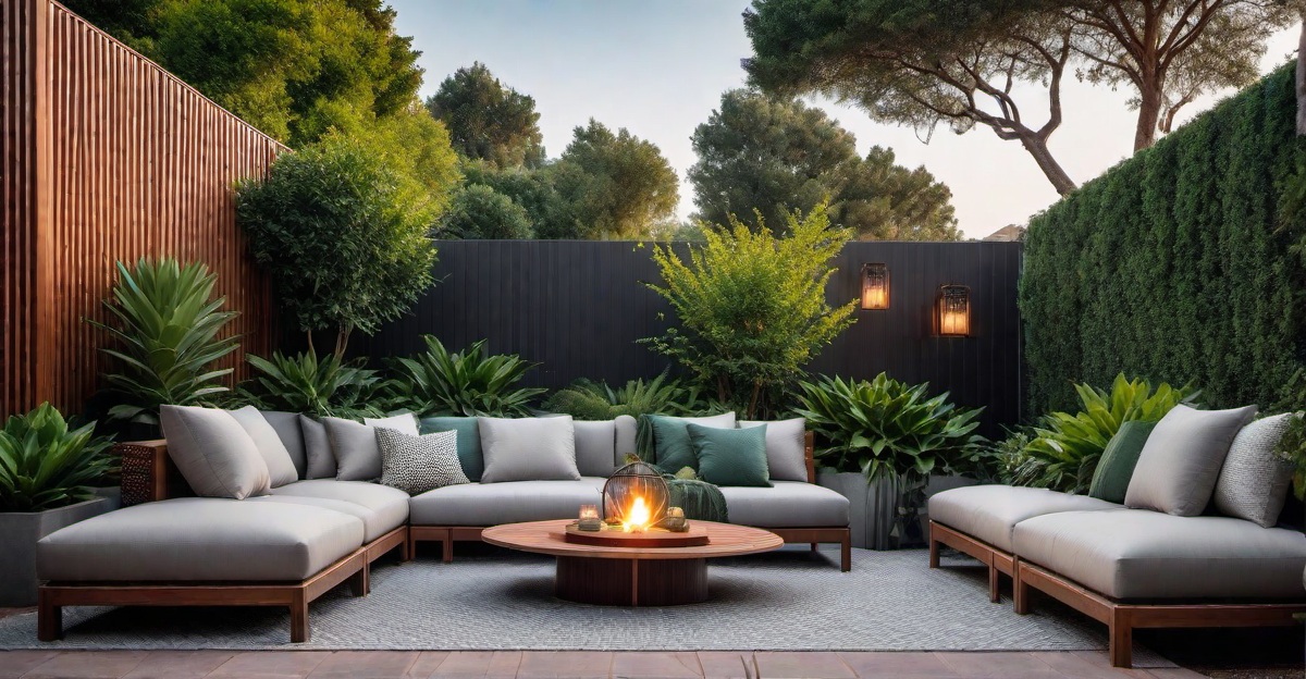 This design showcases an inviting outdoor seating area paved with breeze blocks, creating a charming and cozy retreat. The use of breeze blocks adds a modern and stylish touch to the space while maintaining a laid-back and comfortable atmosphere. The seating area is adorned with plush cushions and accented with vibrant throw pillows, offering a welcoming and relaxed ambiance. Lush greenery and potted plants surround the area, enhancing the connection to the outdoors and providing a refreshing backdrop for the cozy retreat.