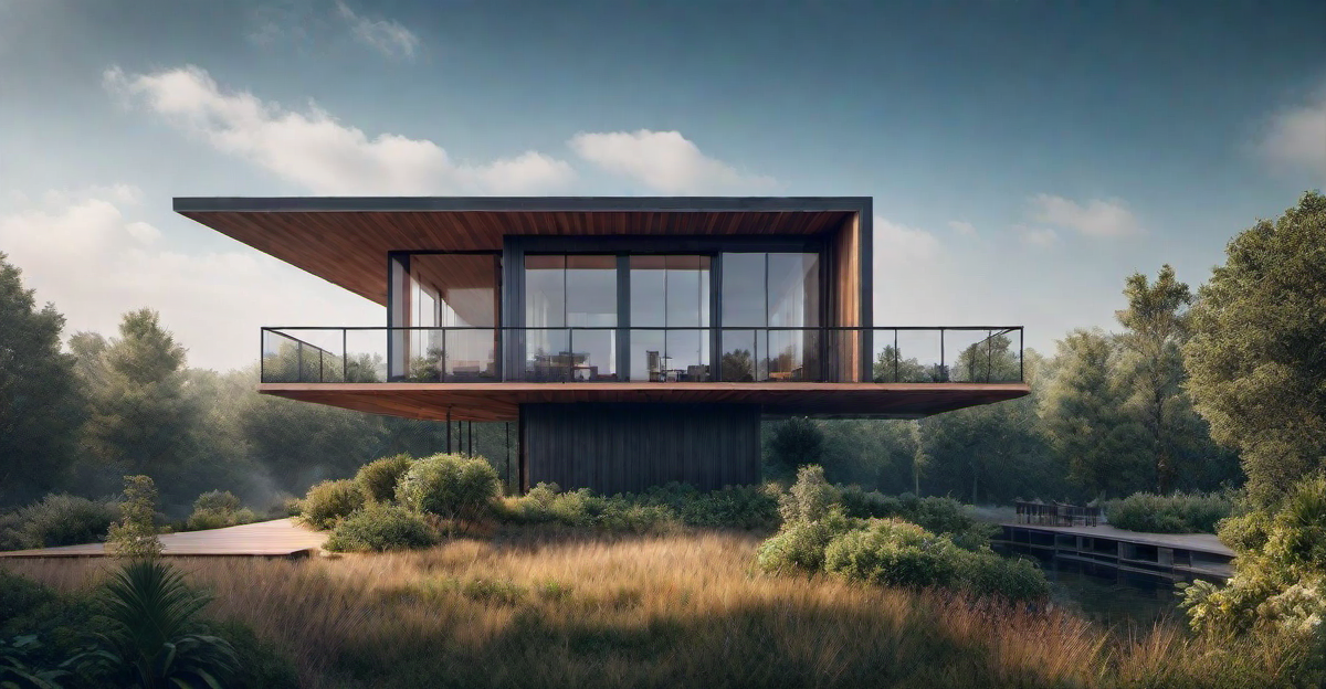 This design features a modern stilt house with a stunning minimalist aesthetic. The elevated structure allows for panoramic views and protects against flooding, while the clean lines and simplicity of the architecture create a sense of calm and tranquility. The interior showcases open spaces, uncluttered surfaces, and a neutral color palette, emphasizing the beauty of simplicity. Large windows bring in ample natural light, blurring the boundaries between indoors and outdoors. The stilt house seamlessly integrates with its natural surroundings, offering a serene and elegant living space.