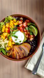 A balanced, build-your-own taco bowl featuring cilantro-lime rice, adobo chicken, black beans, corn and tomato salsas, and classic toppings. Makes about 4 bowls and takes roughly 45 minutes from start to finish.